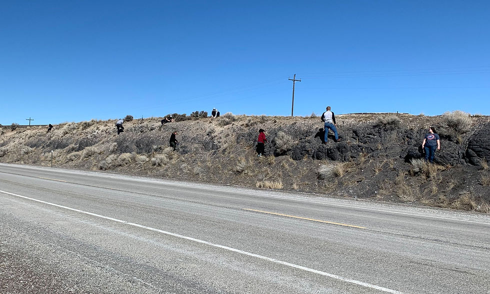 We traveled south from Twin Falls on US-93. A little less than five miles from Nevada, we made a stop at a road cut exposing some black, glassy rhyolite that contains silica concretions known as thunder eggs––I think many thunder eggs were collected.
